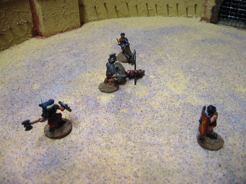 Adiantando-se aos demais, Adventurax atira-se a Philipos. Mal jogado, pois é de imediato posto fo ra de combate pelo mirmidão. Josephus e Ludicus, mais avisados, procuram usar a sua rapidez em proveito próprio, isolando um dos seus adversários. Fazendo esquivas para a esquerda e para a direita, colocam-se do lado de Philipos e atacam-no. Este vê-se aflito mas resiste o tempo suficiente para chegar auxílio. O retiarius é posto fora de combate (“- Ursus, veniunt hic!”) e o venatore é caçado pelos dois adversários.